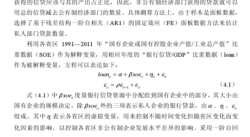 我想根据有关学者的研究方法测量非国有部门获得的信贷。有学者用到的是基于残差结构一阶自相关(AR1)的固定效应(FE)模型。对于这个模型我不是很懂,是直接把soe和loan放在一起回归就可以了吗~~~第一次发帖,还请指点迷津,谢谢~~