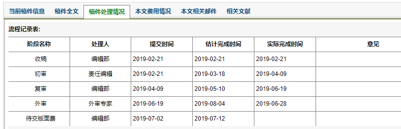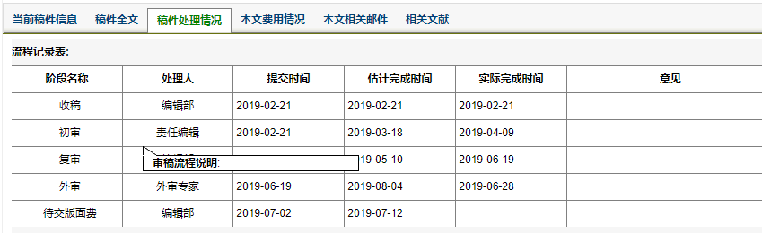 下图是本人的审稿流程,感觉进了外审就很快了。可能是这本期刊最近越来越火的原因吧,初审复审都会超期,不用担心,等着就好(无奈、无奈)