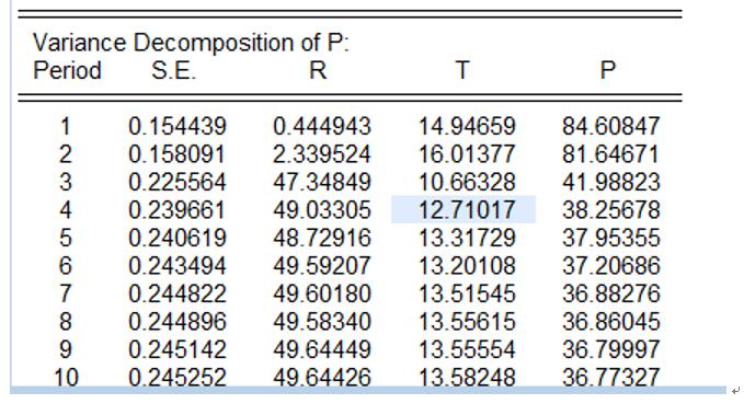 还有就是 我是三组序列建模后 ,三组公式, 阶数为滞后二阶,我的顺序是R T P ,在方差分析中出现这种情况 我对R分解 第一年只有R 100% 对T 分解 第一年的贡献就有R T 对P分解 第一年的贡献就成了 RTP