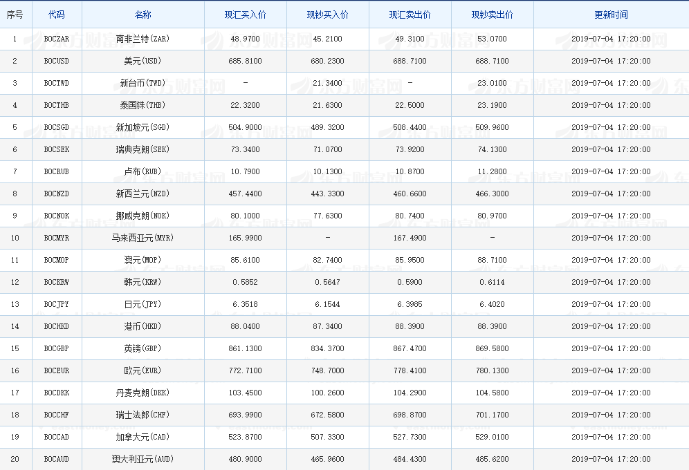 中国银行外汇牌价 2019-07-04(图片来源:东方财富网)
