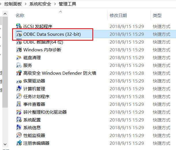1、打开控制面板\系统和安全\ODBC Data Sources(32-bit)。用