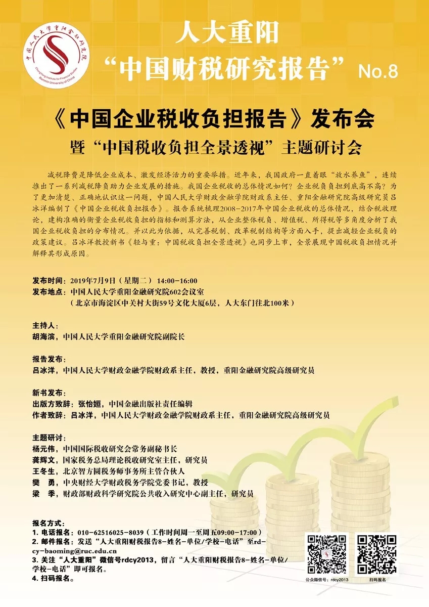 3. 微信报名:关注“人大重阳”微信号rdcy2013,留言“财税报告第8期-姓名-单位/职务-手机号-邮箱”即可报名