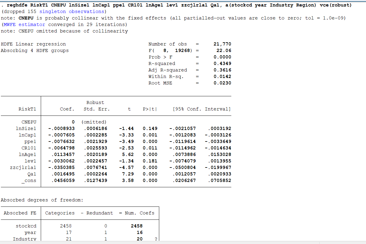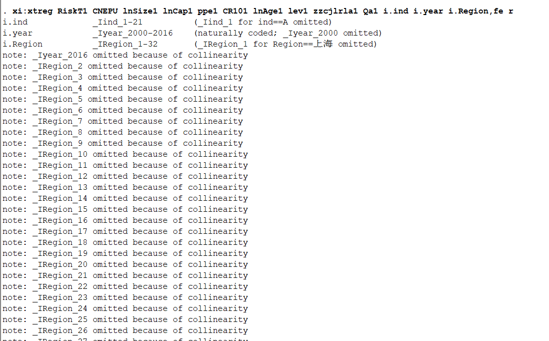 也就罢了 发表于 2019-7-7 15:46 我用2000-2016年的面板数据回归,研究经济政策不确定性对企业风险承担的影响。先引入年度和行业的虚拟变量回 ...
