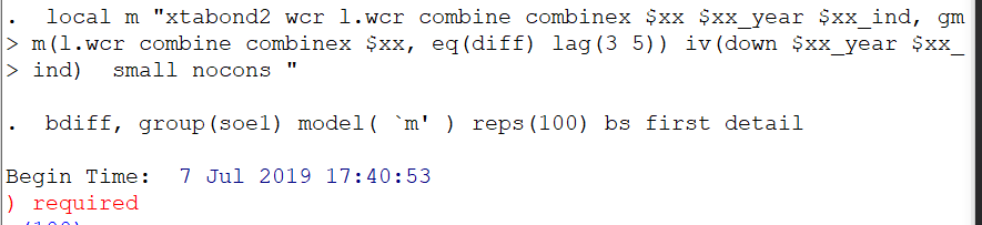 如题,用xtabond2 gmm做了分组回归,用连老师的bdiff命令进行组间差异检验,stata总是提示“)required”,