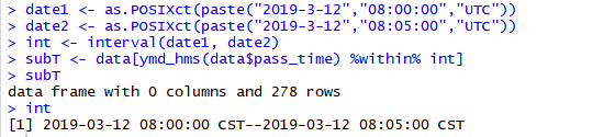 我好像知道问题了 。。。> subT <- data[ymd_hms(data$pass_time) %within% int,] 少写了个逗号 哈哈哈- -