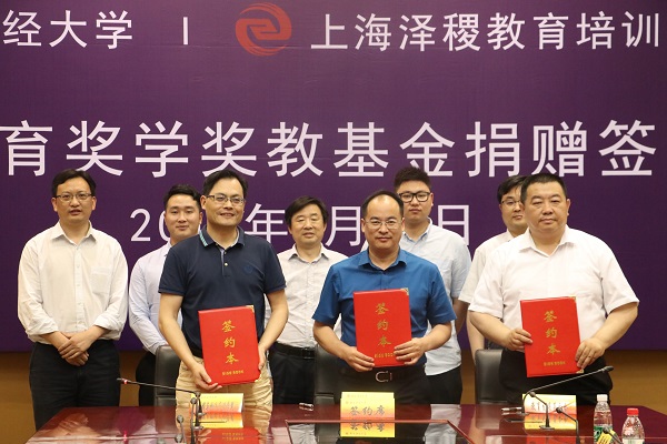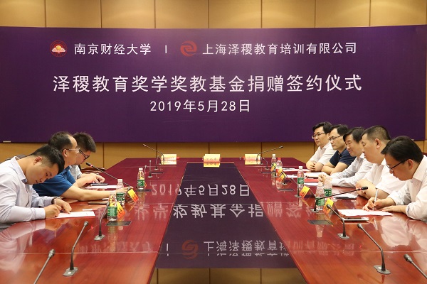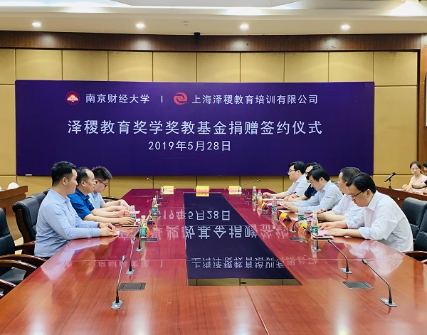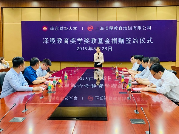 5月28日下午,南京财经大学“泽稷教育奖学奖教基金”捐赠签约仪式在南京财经大学隆重举行。校党委常委、总会计师黄建元,校对外联络处处长卜金涛,营销与物流管理学院院长倪明、党委副书记周进进,上海泽稷教育培训有限公司董事长蒋望、副总裁吴世浩等企业代表出席签约仪式。营销与物流管理学院师生代表参加仪式。仪式由营销与物流管理学院党委书记殷建新主持。