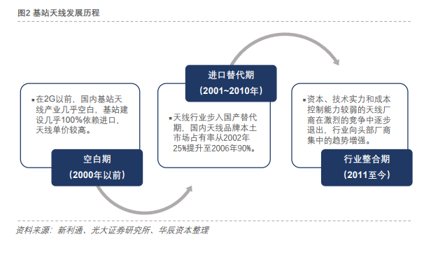 发展历程。国内基站天线市场发展主要经历空白期(2000年以前)、进口替代期(2001~2010年)和行业整合期(2011至今)。1. 空白期(2000年以前):在2G以前,我国基站天线产业几乎空白,基站建设几乎100%依赖进口,天线单价较高。2000年5月信息产业部出台《移动通信系统基站天线技术条件》,标志着我国基站天线产业的真正起步。2. 进口替代期(2001-2010年):此后10年内中国基站天线产业步入国产替代期,国内天线品牌本土市场占有率从2002年25%提升至2006年90%。3. 行业整合期(2011至今):受运营商3G-4G和4G-5G过渡期内投资放缓的影响,资本、技术实力和成本控制能力较弱的天线厂商在激烈的竞争中逐步退出,行业向头部厂商集中的趋势增强。