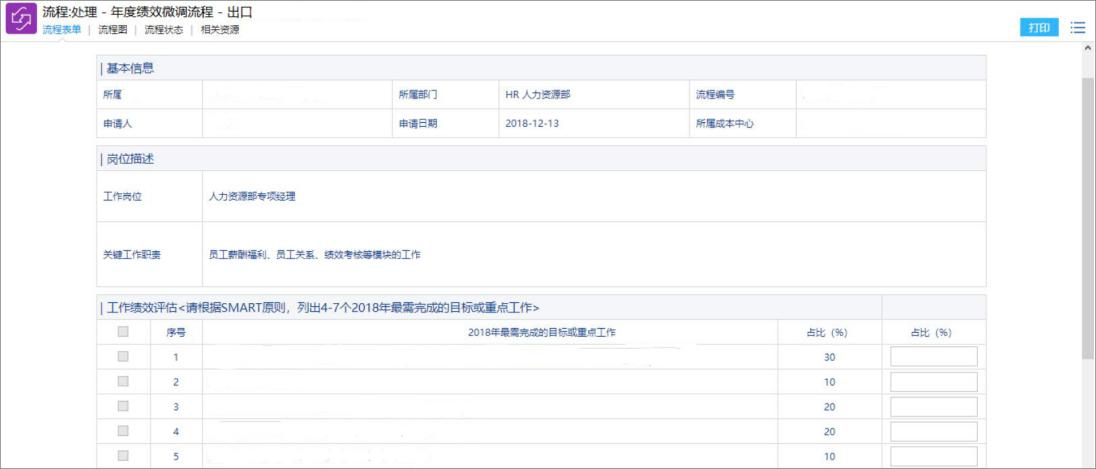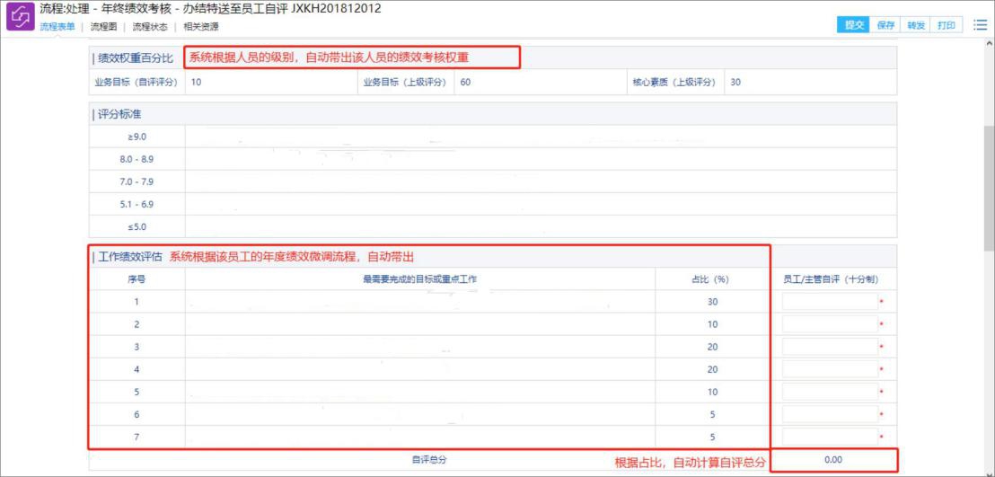 自动化触发流程:年底时,在OA系统设定的指定时间,自动触发所有员工的年终绩效考核流程,并提交到员工自评节点,权重与绩效微调信息自动带出。