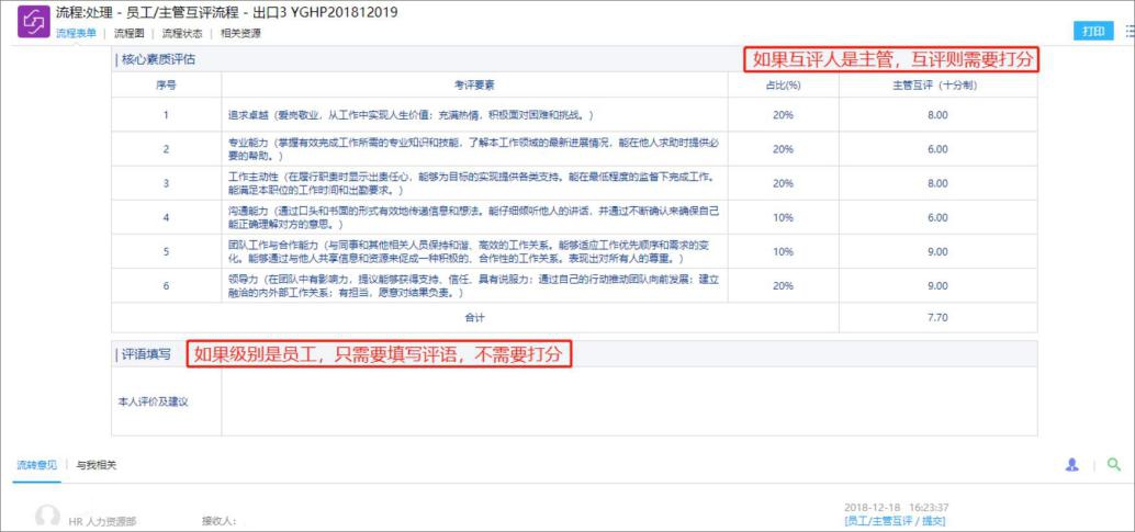 员工/主管互评:为了提高考核评价的公平、准确,互评流程同时触发,针对员工与主管进行打分或评语考核评价。