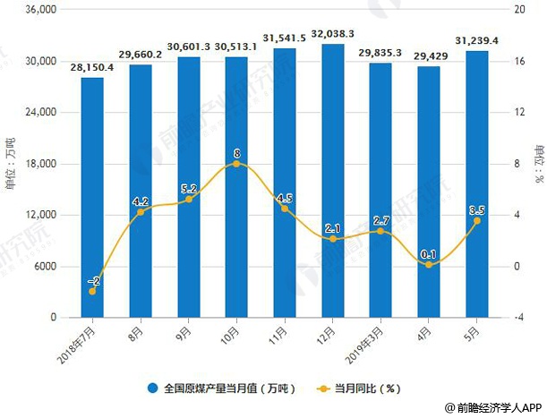 》统计数据显示,2018年3-4季度全国原煤产量有所增长,2018年全年全国原煤产量为354590.8万吨,同比增长5.2%。2019年5月全国原煤产量有小幅度增长,截止至2019年5月全国原煤产量为31239.4万吨,同比增长3.5%,增速比上月扩大3.4个百分点,环比增加1810万吨,增长6.15%。累计方面,2019年1-5月全国原煤产量累计达到142268.6万吨,同比增长0.9%,比去年同期收窄3.1个百分点。