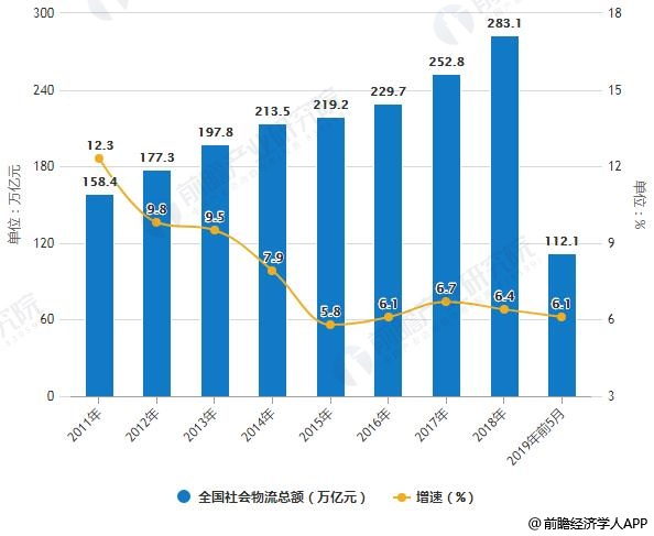 2011-2019年前5月全国社会物流总额统计及增长情况