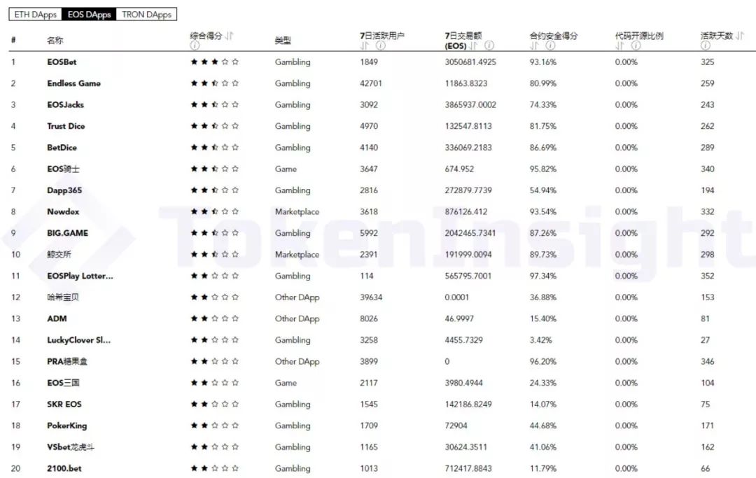 1. EOS DApp排行榜图表1-1:EOS DApp排行榜前20名