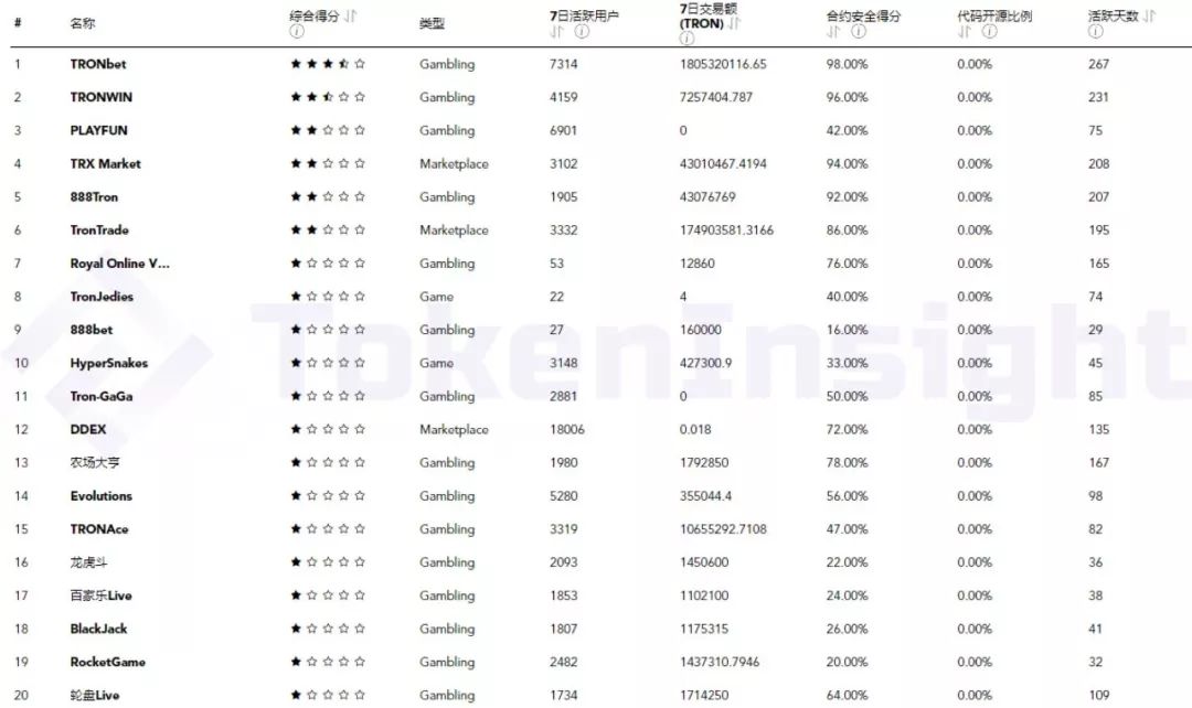 2. TRON DApp排行榜图表2-1:TRON DApp排行榜前20名来源:Tokeninsight官网上周TRON DApp数量新增0个,交易额环比减少0.65%,活跃用户数环比减少8.3%。