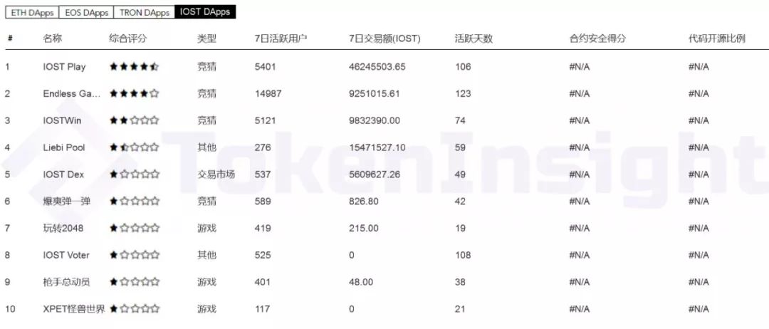 来源:Tokeninsight从本周起,TokenInsight将在DApp 周报中加入IOST DApp 榜单。鉴于IOST平台的发展时间相较其他三者较短,DApp的生态丰富度仍然有待提高,故目前IOST DApp榜单只展示排名前10位的DApp。