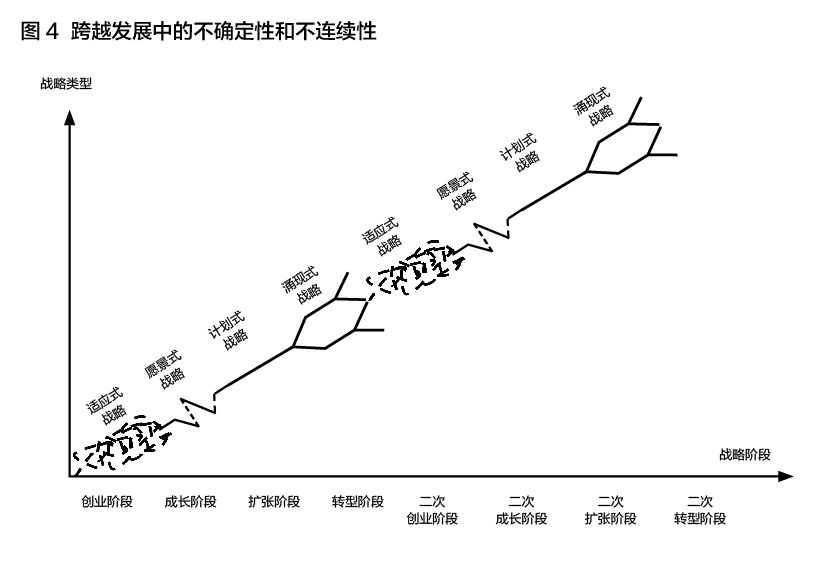 进入成长阶段,企业面临的发展方向的不确定性下降,但面临的发展路径不连续性仍较高。为了应对不连续性带来的波动(Volatility),企业往往采用愿景式战略,通过愿景确定企业发展的方向,通过愿景引领企业克服发展路径的不连续性。