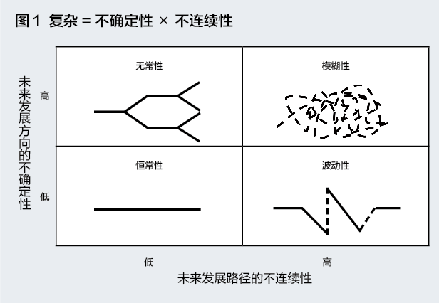 不确定性低但不连续性高的情况可以用图1右下角的折线图形表示。不确定性低意味着前进方向是比较确定的了,但不连续性高意味着在前进的道路上需要克服很多障碍。这就好比参加各种挑战赛的人,虽然终点的方向已经确定,但要自己想办法克服困难才能到达终点,这种情况可以被称为波动性(Volatility)。