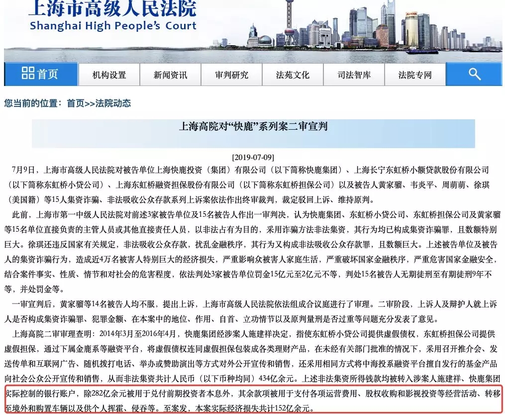 2019年1月,“快鹿案”一审宣判涉“集资诈骗罪”,14名被告人均不服上诉;7月9日,上海高院二审作出驳回上诉、维持原判的终审裁定;依法判处3家被告单位罚金15亿元至2亿元不等,判处15名被告人无期徒刑至有期徒刑9年不等,并处罚金等。