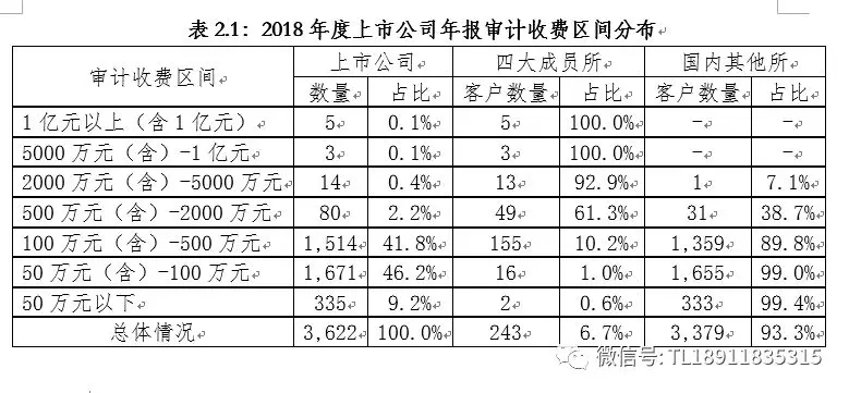 审计收费在一定程度上反映年报审计市场的竞争状况。从年报审计收费区间看,审计收费在2,000万元以上的上市公司共22家,主要分布在金融、能源和建筑等行业,21家为四大成员所的客户。在500万元(含)至2,000万元的审计收费区间内,四大成员所与国内其他所相比仍具备较大优势。在100万元以下的审计收费区间内,四大成员所涉足较少,基本由国内其他所承做。2018年度上市公司审计收费区间分布如下表所示。