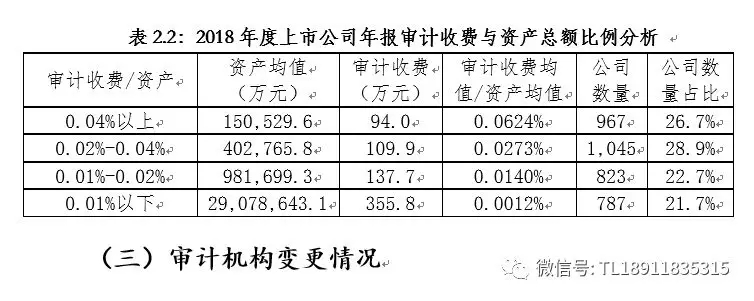审计收费占资产总额的比例是衡量审计收费水平的重要指标。随着上市公司资产规模增大,审计收费占公司资产总额的比例明显降低。2018年度,上市公司审计收费均值为165.4万元,资产均值为669.8亿元,审计收费均值与资产均值的比例为0.0024%;上市公司审计收费中位数为90万元,资产中位数为40.8亿元,审计收费与资产比例的中位数为0.022%。2018年度上市公司年报审计收费与资产总额比例分析如下表所示。