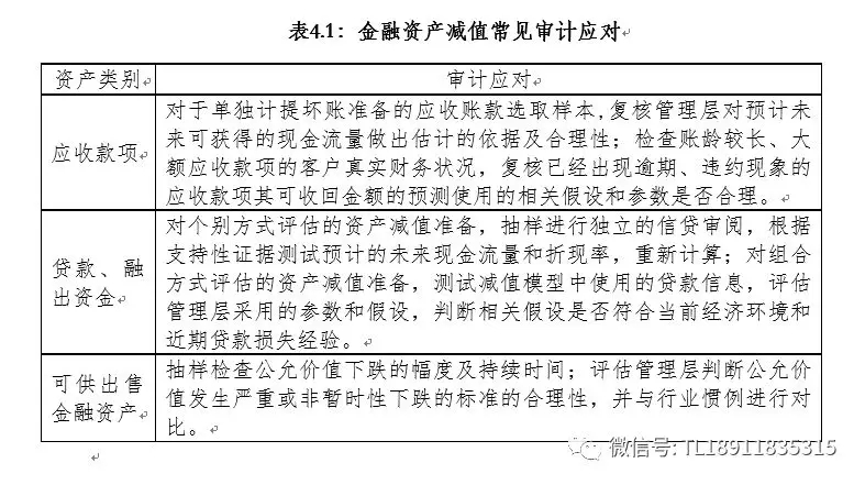 资产减值事项常见审计应对包括:了解及评价与资产减值相关的内部控制设计的合理性,测试关键控制执行的有效性;对管理层使用的假设进行合理性分析;利用专家工作,复核其工作成果并评价专家的胜任能力、专业素质和客观性;对关键参数执行敏感性测试;考虑类似资产的市场价值、变现率及处置费用以评估资产减值合理性等。金融资产减值事项常见审计应对如下表所示。
