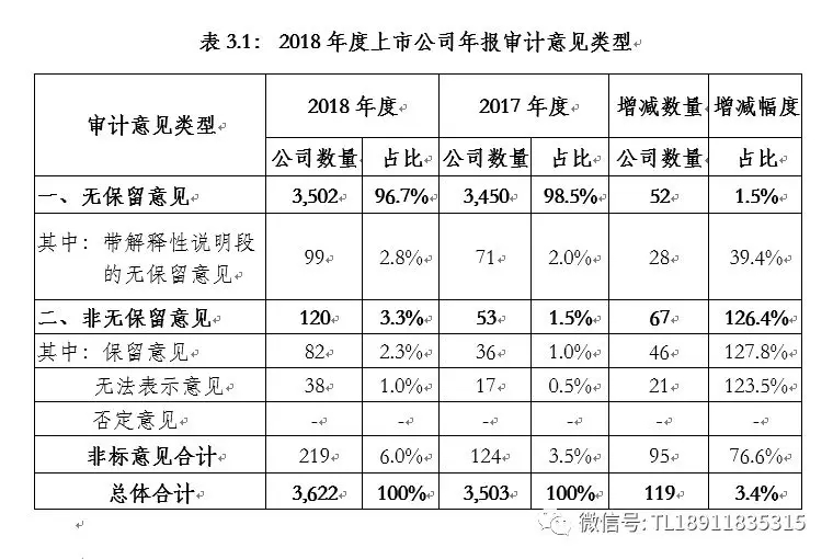 截至2019年4月30日,除*ST华泽等5家上市公司外,3,622家上市公司按期披露审计报告。从审计意见看,3,502份审计报告为无保留意见、82份为保留意见、38份为无法表示意见,分别占比96.7%、2.3%和1%。相比去年,保留意见及无法表示意见数量增长超过一倍。在无保留意见中,99份为带强调事项段、持续经营重大不确定性段的无保留意见,较去年增长近40%。为便于分析,本文将带强调事项段及持续经营重大不确定性段的无保留意见、保留意见、无法表示意见和否定意见的审计报告合称为“非标报告”。2018年度上市公司审计意见类型情况如下表所示。