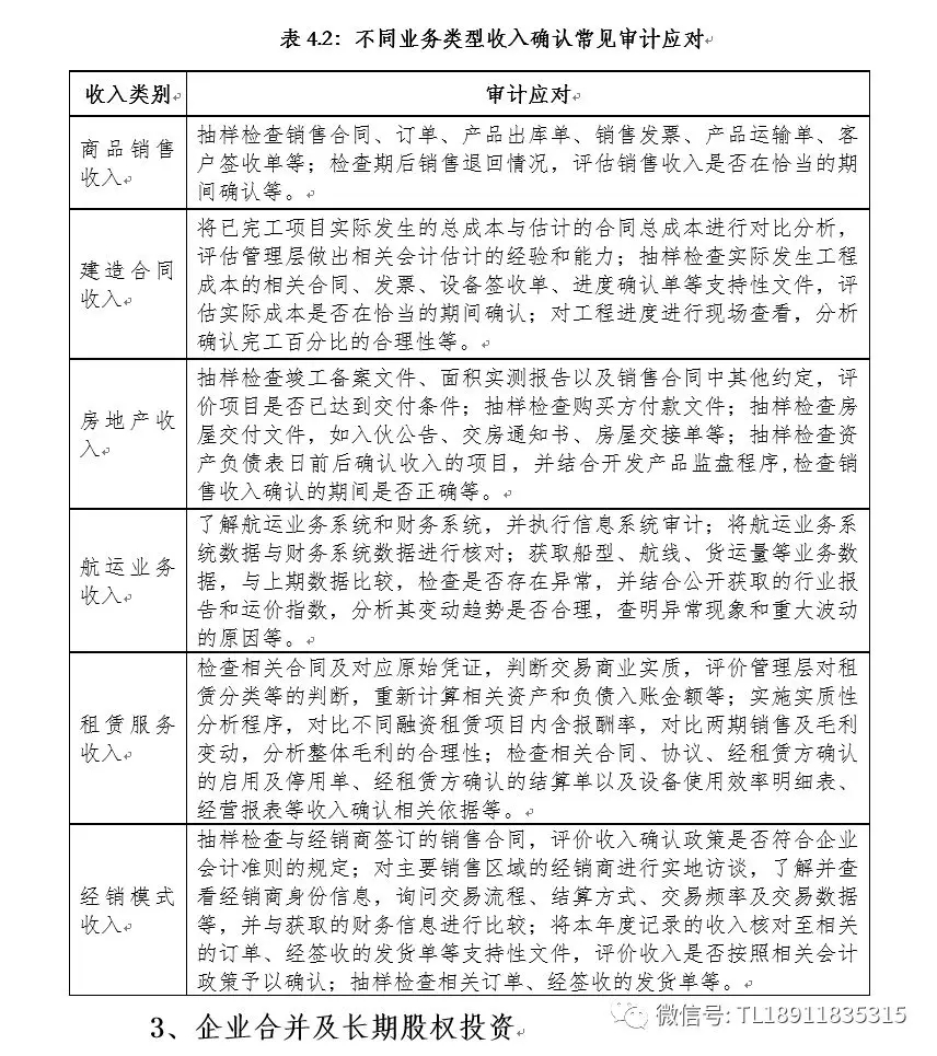 收入确认事项常见审计应对包括:了解、评估并测试收入流程及关键内部控制,测试信息系统一般控制和收入流程相关自动控制;通过审阅销售合同、访谈管理层来了解和评估收入确认政策;抽样检查与收入确认相关的支持性文件;对重大客户、关联方、新增客户的销售执行交易函证,通过网络背景调查、电话访谈或实地走访等方式证实交易情况;选取样本查看工程现场,分析确认完工进度的合理性。不同业务类型收入确认常见审计应对如下表所示。