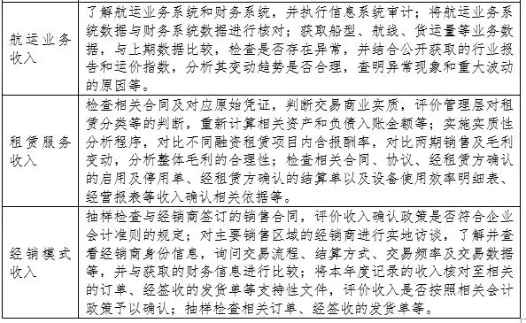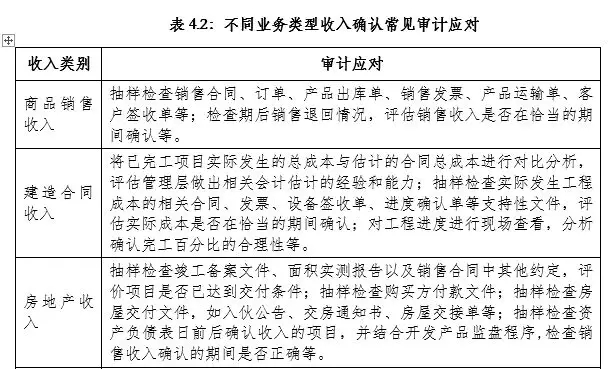 收入确认事项常见审计应对包括:了解、评估并测试收入流程及关键内部控制,测试信息系统一般控制和收入流程相关自动控制;通过审阅销售合同、访谈管理层来了解和评估收入确认政策;抽样检查与收入确认相关的支持性文件;对重大客户、关联方、新增客户的销售执行交易函证,通过网络背景调查、电话访谈或实地走访等方式证实交易情况;选取样本查看工程现场,分析确认完工进度的合理性。不同业务类型收入确认常见审计应对如下表所示。