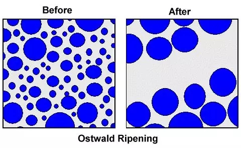 奥斯瓦尔德熟化:非匀质中,溶质颗粒倾向于汇聚成更大的颗粒以使总表面积最小(能量最低)。