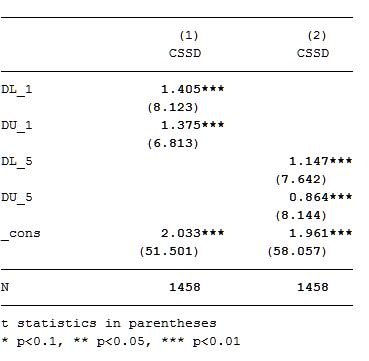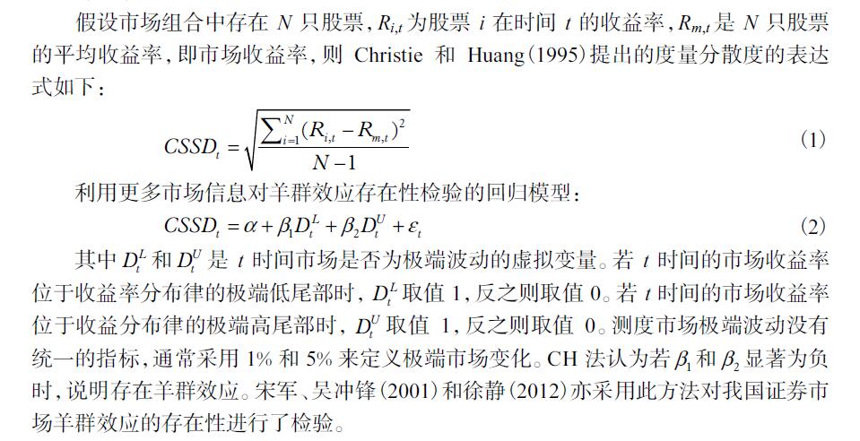 从结果可以看出,不管是在1%,还是5%,标准下,回归系数β1和β2都显著为正,市场极度涨跌时即市场收益率为极高和极低的1%,和5%,时,个股收益率明显的分散,与CSSD 模型认为市场存在羊群效应时β1 和β2 应显著为负的假定不符,说明市场不存在显著羊群行为。