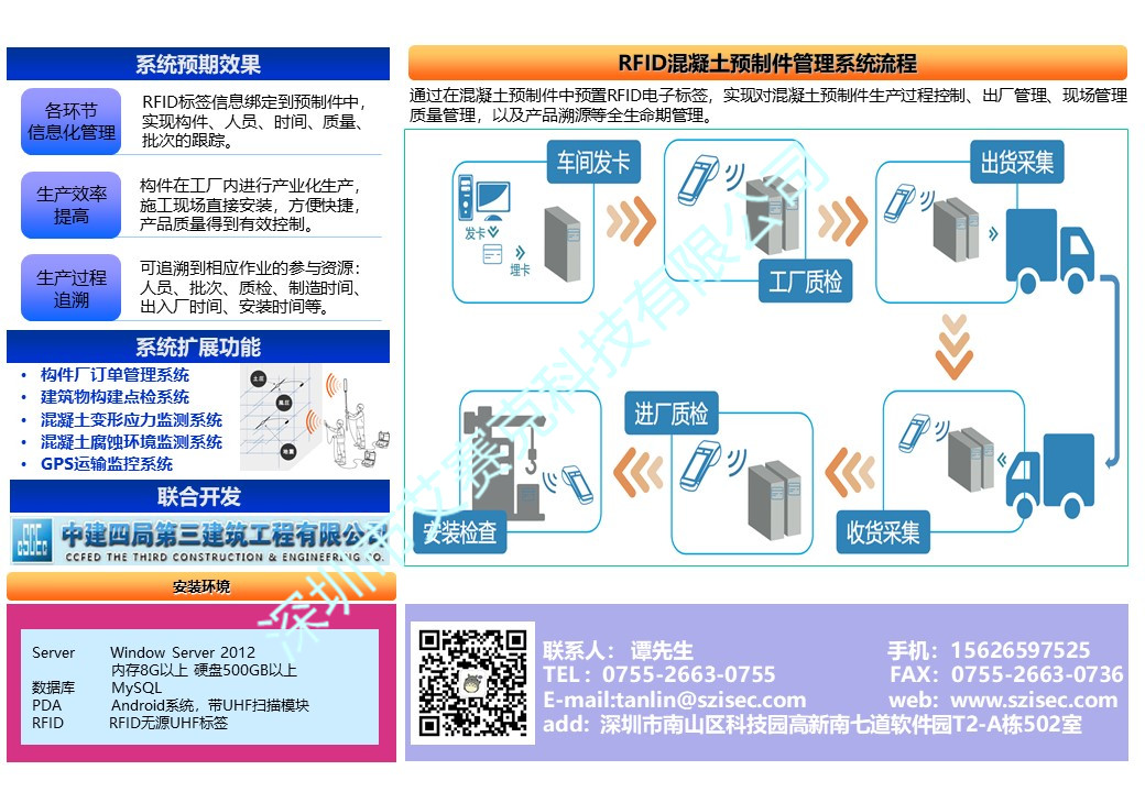 项目目的通过RFID混凝土预制件管理系统,帮助构件厂和施工现场,解决沟通及管理过程中困扰。实现信息实时共享、信息可视化、规避风险、提高构件品质、较少沟通成本。