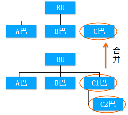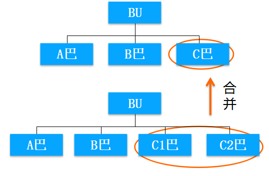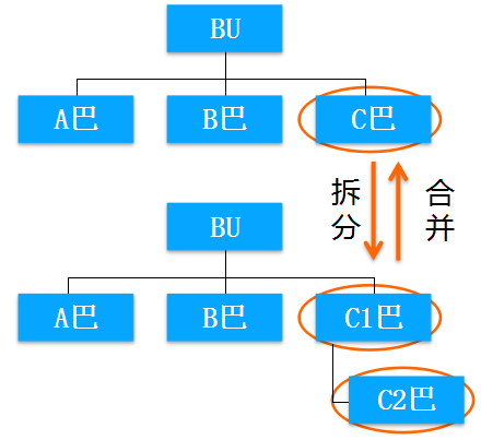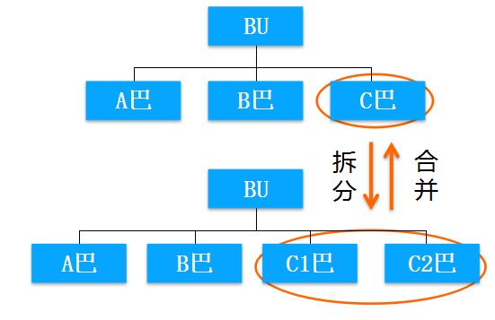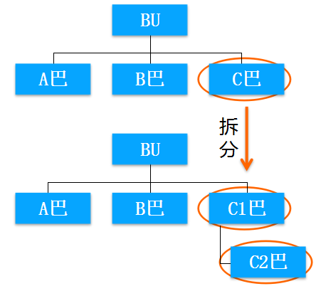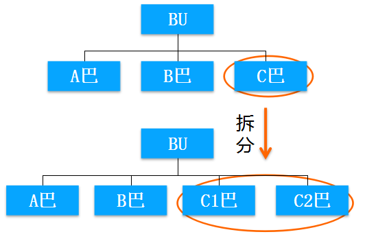 我们看到,在上面那个阿米巴里面有一个C巴。那么拆分的时候,它就拆成了C1和C2两个阿米巴。即,在上面的组织架构里,它的二级阿米巴有三个,在下面的组织架构里,它的二级阿米巴就有四个。其中两个就是由于以前的C阿米巴拆分出来的。这种拆分方式就称为横向拆分。