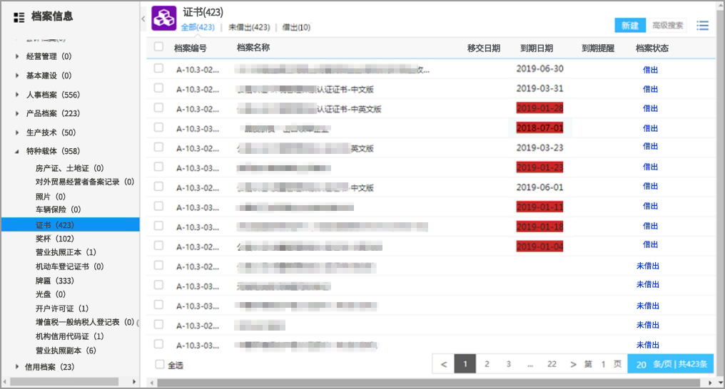每份被借出去的档案,管理员直接通过系统的台账页面就能监控返还情况,即将到期或已经超期的文件,会直接通过色块标记出来。