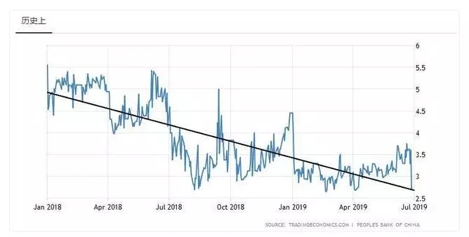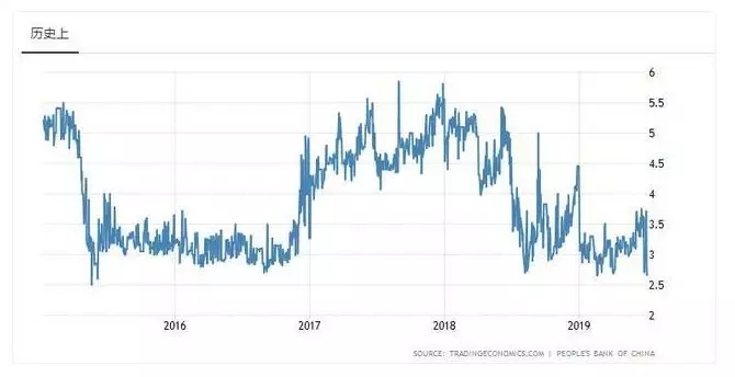 据TRANING ECONOMICS数据,中国银行间同业拆借利率从2015年的5%左右,降到了2019年的2%左右。