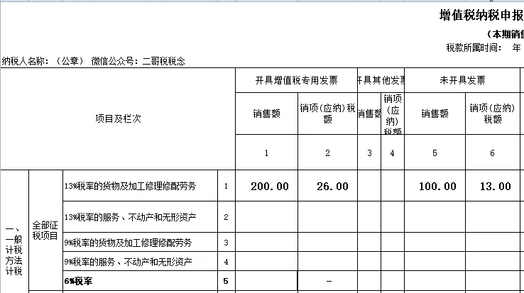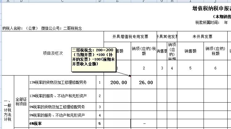 比如一般纳税人,当期取得100的未开票不含税收入,税率13%。开专票收入还有200(不含税),税额26。那么填表如下,当期的未开票收入和税额填写到附表一的5、6列。