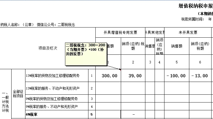 比如,上述113的未开票申报,次月又开具了专用发票。同时当期还有200的不含税开票收入,申报表第1、2列只填写当期200的数据。其实这200有个过程,相当于200(开票金额)+100(补票金额)-100(未开票收入金额)=200.