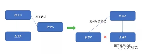 上图中,企业A花了30亿从原股东C中收购了企业B,但是B的账面净资产仅10亿元。会计师在编写合并报表的时候,不能写付出30亿,得到的资产才10个亿,否则一收购就要亏损20亿,市场上估计就没收购这一回事儿了。那多的20亿去哪儿了呢,在报表中就体现为商誉了,这也是一般情况下商誉产生的原因。