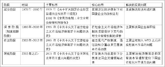 国有企业改革分析基本都把1993年《中共中央关于建立社会主义市场经济体制若干问题的决定》、2003年《中共中央关于完善社会主义市场经济体制若干问题的决定》、2013年《中共中央关于全面深化改革若干重大问题的决定》作为关键分界标志。这一概要化的改革阶段划分及具体阶段重点内容梳理如下表1所示。