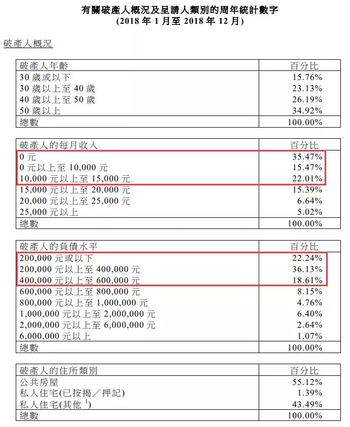 2018年申请破产的人当中,73%的人收入在1.5W元以下,这个薪资水平在香港足够低了,而他们的负债水平77%都在60W以下。