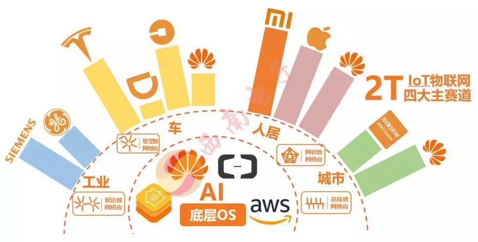 ToT的IoT物联网:2T代表着唤醒万物的全新生产关系,是互联网发展的终极形态,是一种赋能Things的极致数字化,我们按场景将其分为家、车、工业、城市4大主赛道,目前小米在家庭场景、特斯拉在车用场景,阿里在城市场景具备显著先发优势。