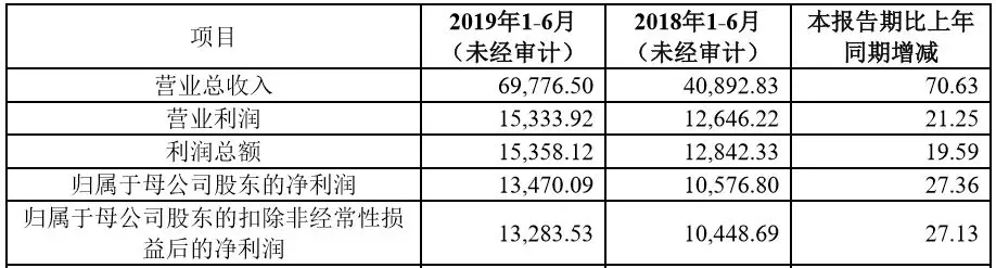 2019年上半年营业收入、净利润同比分别增长70.63%、27.13%。