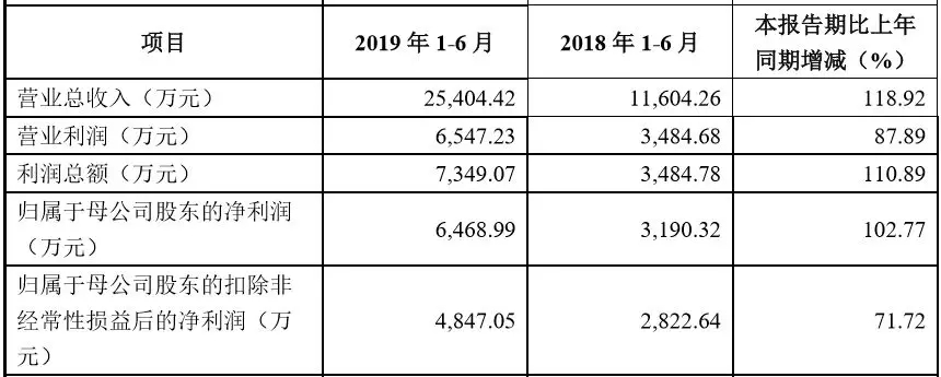 2019年上半年,营业收入、净利润同比分别增长118.92%、71.72%。