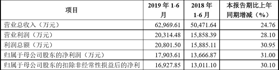 2019年上半年,营业收入、净利润同比分别增长24.76%、30.10%。