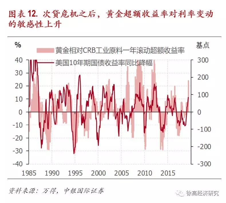 黄金本质上是一种商品,金价与大宗商品价格走势高度同步。在脱离了货币属性之后,黄金本质上就是一种价格昂贵的商品。所以很自然地,黄金价格与大宗商品价格之间有密切联系。观察过去几十年的数据,金价增长率与CRB工业原材料价格指数变化率之间的正相关性非常明显——黄金价格的牛市时期其实也是大宗商品的牛市时期。而相比CRB工业原材料指数,黄金价格的波动频率更高。看起来,大宗商品价格决定了黄金价格的运动中枢,而黄金自身的特性则带来黄金价格对大宗商品整体价格的短期偏离。对黄金价格的分析需要从这两个方面来切入。(图表 9)