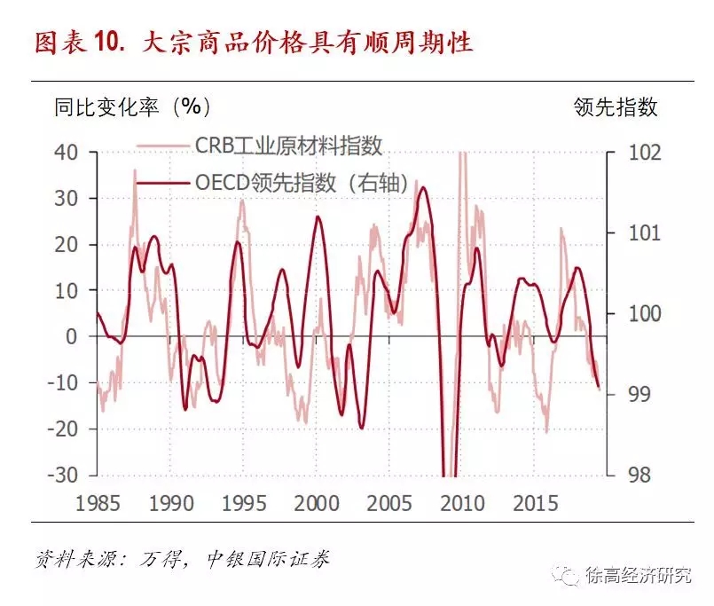 大宗商品价格有明显顺周期性,黄金牛市通常产生于经济繁荣期。对大宗商品的需求主要决定于全球经济的经济状况。经济增长状况越好,对大宗商品的需求就越强。这样一来,就形成了大宗商品价格与经济周期间的同步性——大宗商品价格顺经济周期而运动。这种顺周期性可以从CRB工业原材料指数涨幅与OECD领先指数(表征全球经济景气度的一个重要指标)间的正相关性看出来。由于大宗商品价格决定了金价的长期趋势,所以金价的最主要决定因素是全球经济景气。经济繁荣期所形成的大宗商品价格通胀往往容易催生黄金牛市。
