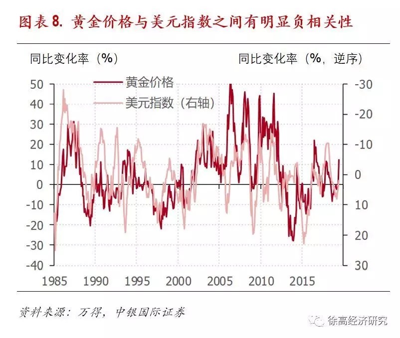 金价与美元指数之间有明显负相关性;但这种负相关性在美元指数与其他大宗商品价格之间也普遍存在。美元指数是表征美元强弱的指标。金价涨幅与美元指数变化率之间有明显的负相关性——美元走弱的时候,金价往往走强。不过,与美元的这种负相关性并不只是黄金才有。事实上,由于各类大宗商品基本都以美元为计价物,所以美元指数与许多大宗商品的价格之间都有明显的负相关性。(图表 8)