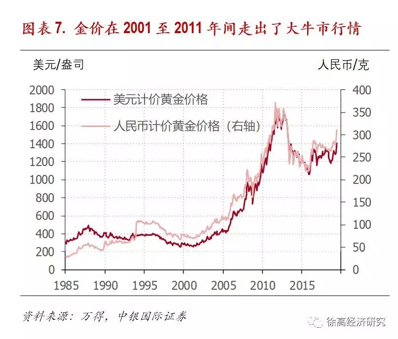 黄金价格通常以美元作为计价物来标示。美元是国际上最主要的储备货币,也是标定黄金价格的最主要计价物。国际上,通常以金衡盎司作为黄金的计重单位;1金衡盎司等于31.1035克。国际上的黄金报价通常以每金衡盎司黄金的美元价格来标定。在2001年到2011年间,黄金价格曾走出了一波长期的牛市(中间仅在次贷危机时期有明显回调),金价从一开始的不足300美元/金衡盎司,一路上涨到高点约1800美元/金衡盎司。而从2018年下半年开始,金价又开始明显上扬。2018年年底,金价达到了1282美元/金衡盎司。按这个价格来计算,2018年末人类所拥有的黄金总价值大概为8万亿美元。(图表 7)