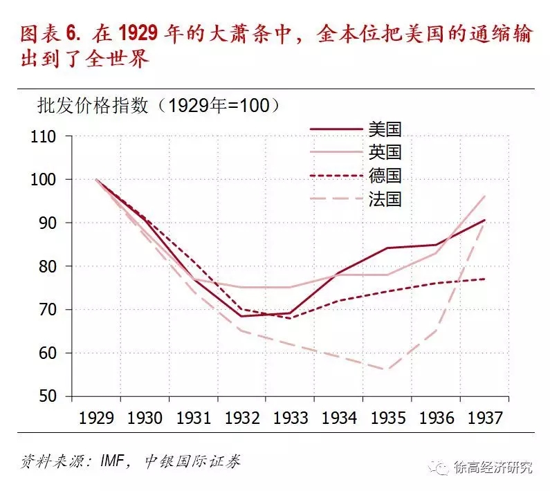 “金本位”退出历史舞台有其道理。以上所罗列的金本位的问题其实早就存在,而且人类社会已经在这上面交过了学费。在1929年大萧条之前,金本位曾流行一时。但也正是在缺乏灵活的金本位制下,美国的通缩被迅速输出到了全世界,把其他国家也拉入了萧条。直到几年之后各国纷纷退出金本位,通缩的状况才有所缓和,为全球经济复苏扫除了一个障碍。可以说,大萧条的发生已经通过一次深刻的教训来充分展现了金本位的弊端。中央银行家们自然不会忘却这段历史。(图表 6)