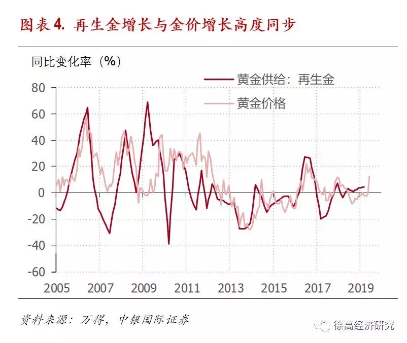 很显然,金价越高,人们还原利用黄金的意愿越强。从数据上来看,再生金的增长与金价增长高度同步——金价增长得越快,再生金增长率越高。这样,再生金的供给就自动成为了金价的一个稳定器——金价越高,再生金供给越多,进而形成对金价的约束。(图表 4)