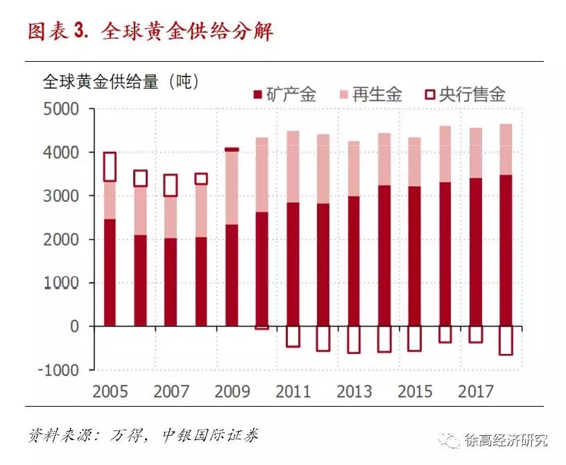 需要注意,黄金供需平衡表反映的是黄金市场上的供给和需求。黄金市场上的一部分供给来自持有黄金的机构和个人的黄金出售行为,这部分供给并不带来黄金存量的增加。所以,在黄金的供需平衡表中,只有“矿产金”才是会真正增加人类所持有的黄金总量的黄金供给;供需平衡表中的“再生金”和“央行售金”只是带来黄金在人类社会中分布的变化,并不增加全人类所拥有的黄金总量。(图表 3)