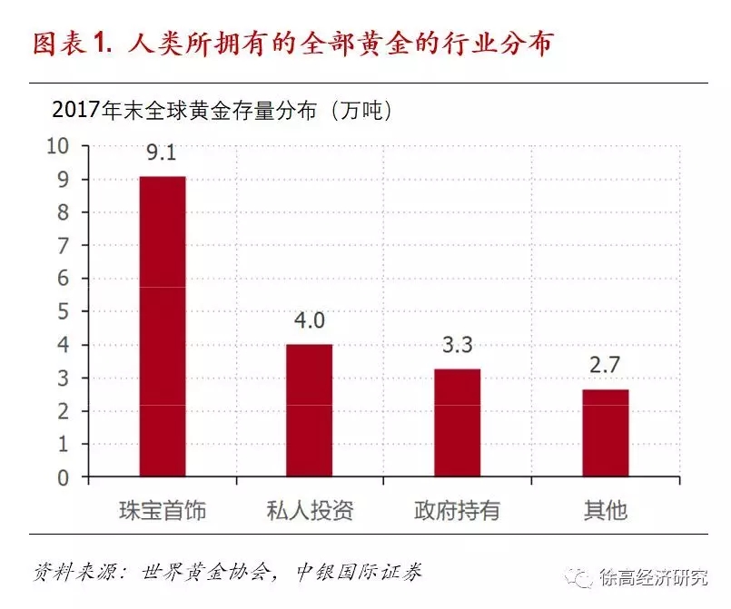 世界黄金协会(World Gold Council)估计,2017年底世界上的黄金总存量约为19万吨[1]。由于黄金的密度是19.32吨/立方米,所以这19万吨黄金的总体积约为1万立方米。如果将这些黄金铺满在一个标准足球场上,那么大概能堆出1.4米的高度。在这19万吨黄金中,珠宝首饰大概占了9万吨,私人投资占了大概4万吨,政府持有(主要是中央银行持有)约3万吨。还有剩下的约3万吨应该主要应用到各种工业及医疗用途上。(图表 1)